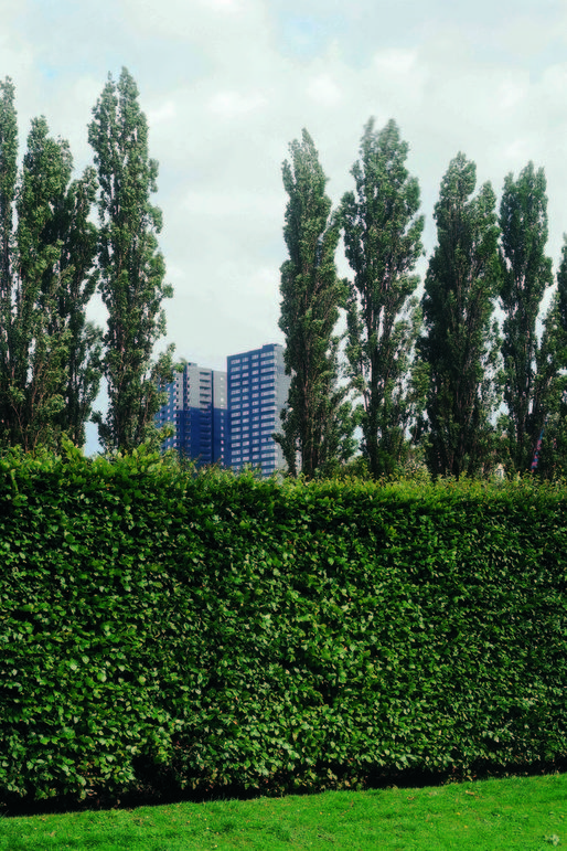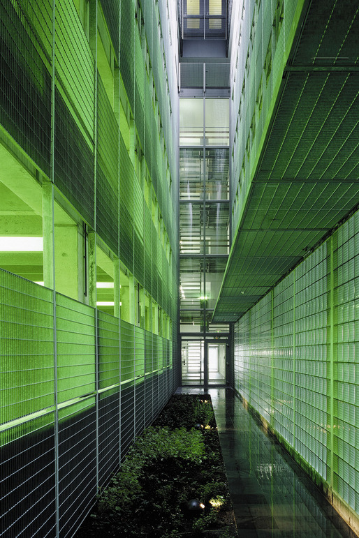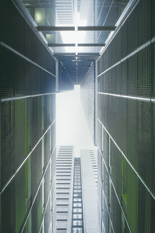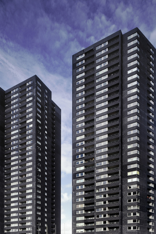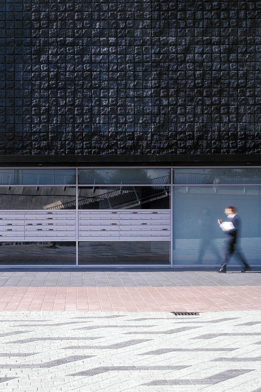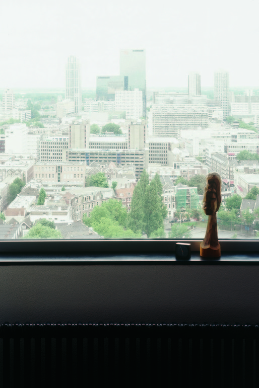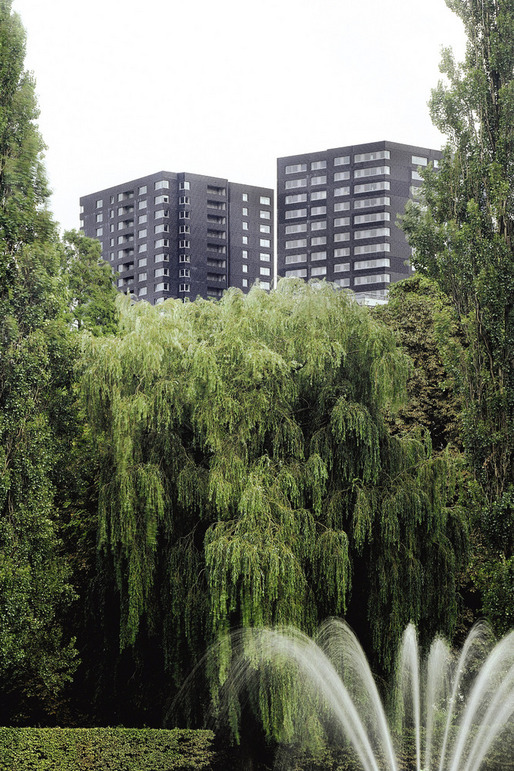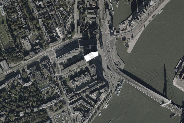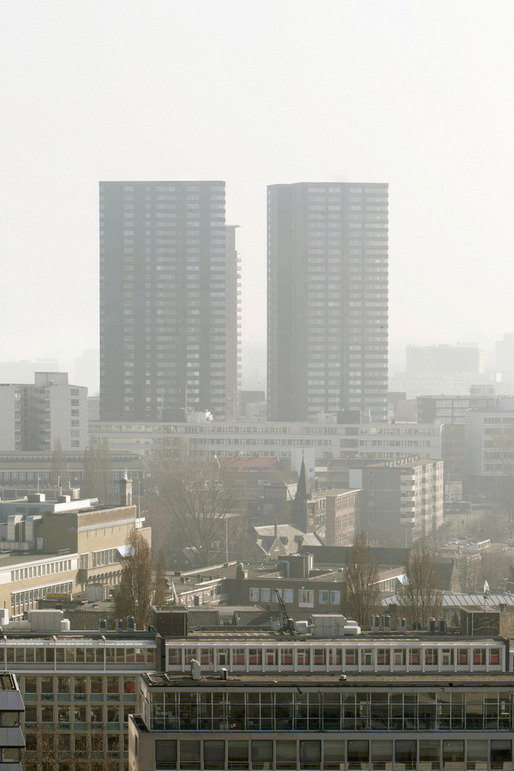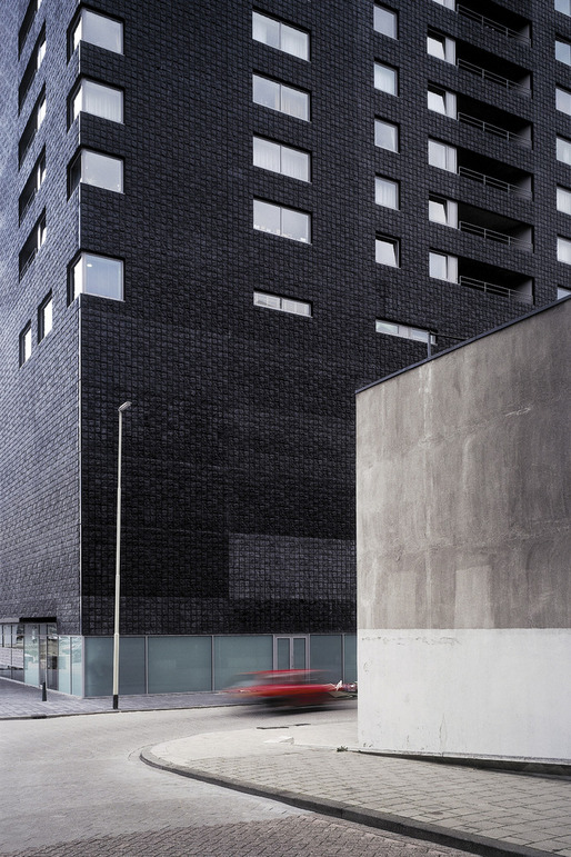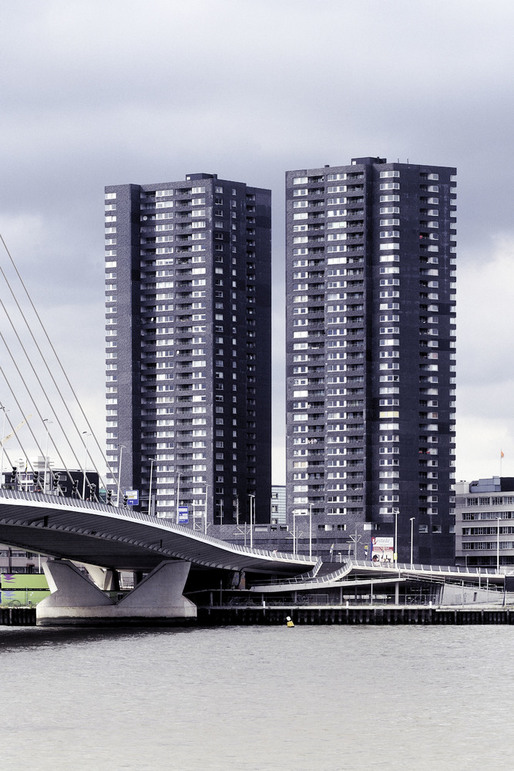 This high rise intervention into the center of the Rotterdam is located along the river Meuse, and its primary mass is incised by a large vertical void that aligns with the monumental Erasmus Bridge in order to visually connect the river's two banks. This void divides the tower into two smaller towers that together contain 290 apartment situated on a 6-story plinth. This plinth contains public and resident parking, storage, shops, cafés, and the main entry hall. A second incision perpendicular to the first creates the public hallways of the two towers; it further enables natural light to spill into the interiors of each apartment. The towers stand within a green terrace on the roof of the plinth, onto which the lobbies open, so that ample outdoor space is offered to residents, in additional to that of their private terraces. The plinth's entire ground floor is glazed in order to introduce an atmosphere of lightness and transparency to the streetscape that surrounds it, which juxtaposes the massive black volumes of the tower–they seem to float above. Situated in such a way that the apartments are equally divided between those with river and those with city views; the tower's façade is wrapped with prefabricated concrete panels imprinted with a pattern that recalls the texture of coal, which, over time, has faded to light gray–which makes the tower an ever changing play of shadow and light within the city's skyline.